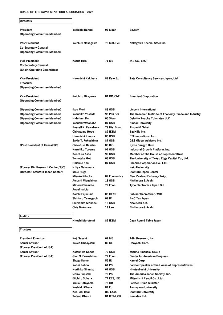BOARD OF THE JAPAN STANFORD ASSOCIATION